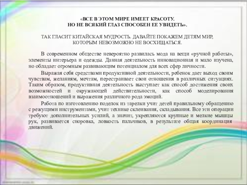В современном обществе невероятно развилась мода на вещи «ручной работы», элементы интерьера и одежды. Данная деятельность инновационная и мало изучена, но обладает огромным развивающим потенциалом для всех сфер личности.