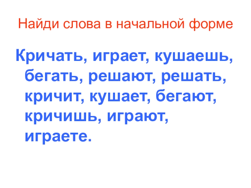 Найди слова в начальной формеКричать, играет, кушаешь, бегать, решают, решать, кричит, кушает, бегают, кричишь, играют, играете.