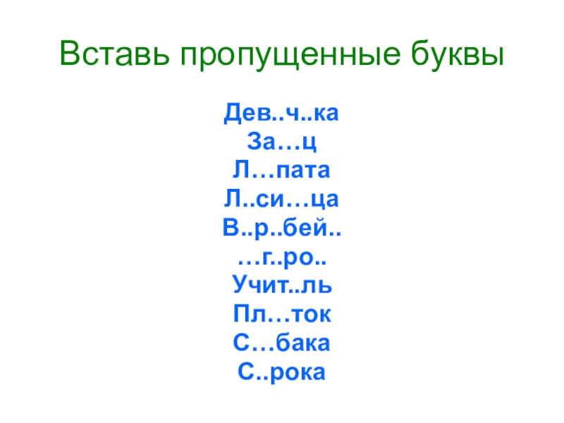Вставь пропущенные буквыДев..ч..каЗа…цЛ…патаЛ..си…цаВ..р..бей..…г..ро..Учит..льПл…токС…бакаС..рока