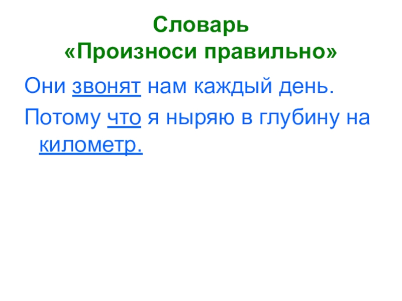 Словарь  «Произноси правильно»Они звонят нам каждый день.Потому что я ныряю в глубину на километр.