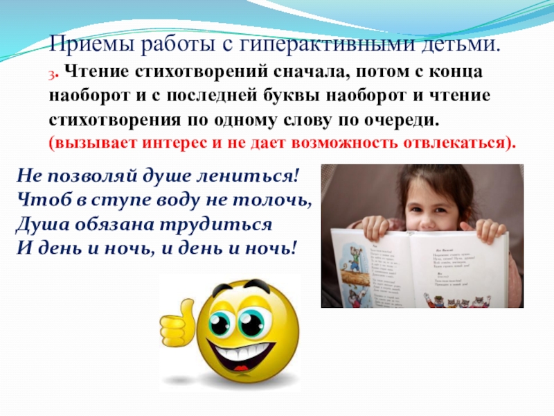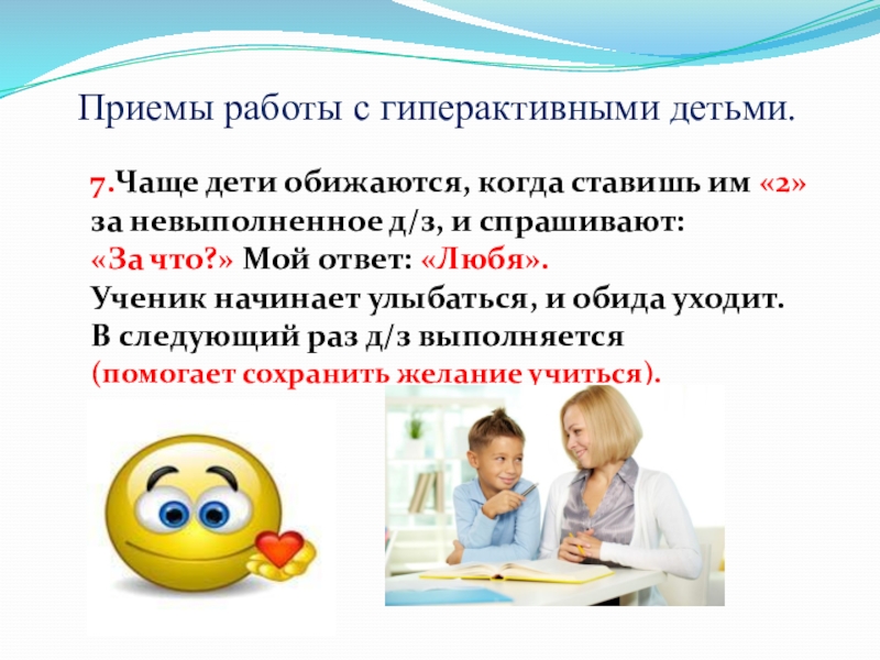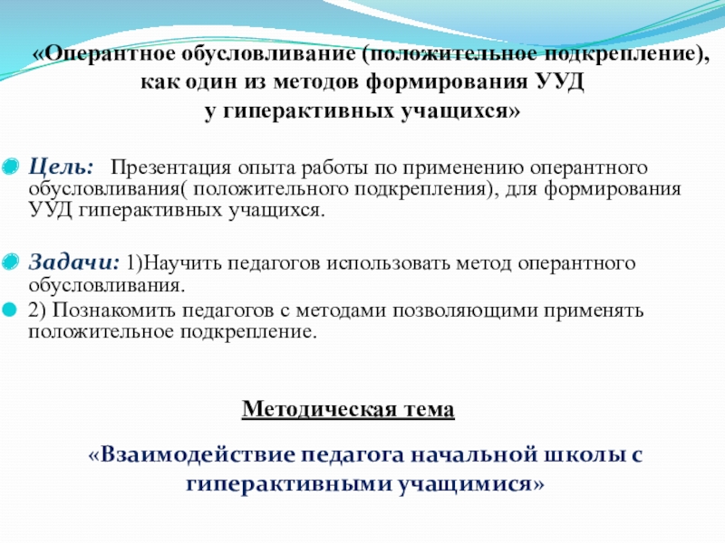 Цель: Презентация опыта работы по применению оперантного обусловливания( положительного подкрепления), для формирования УУД гиперактивных учащихся.