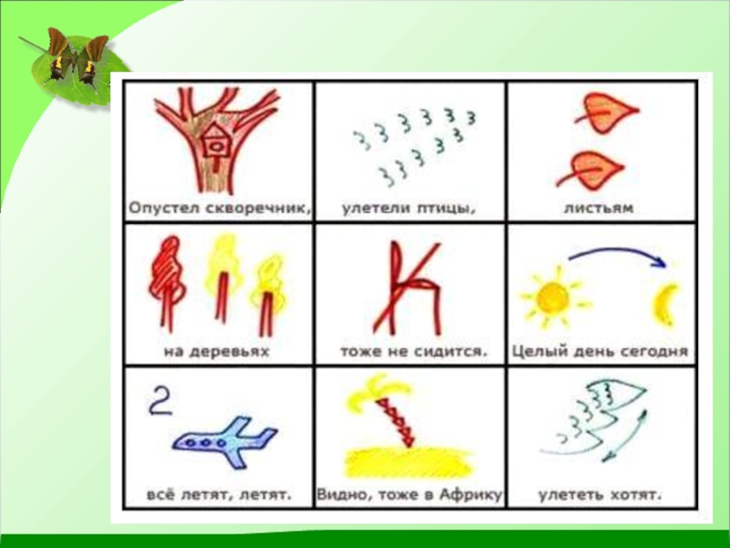 картинка (изображение); таким образом, все стихотворение зарисовывается схематически. После этого ребенок по памяти, используя графическое изображение, воспроизводит стихотворение целиком.