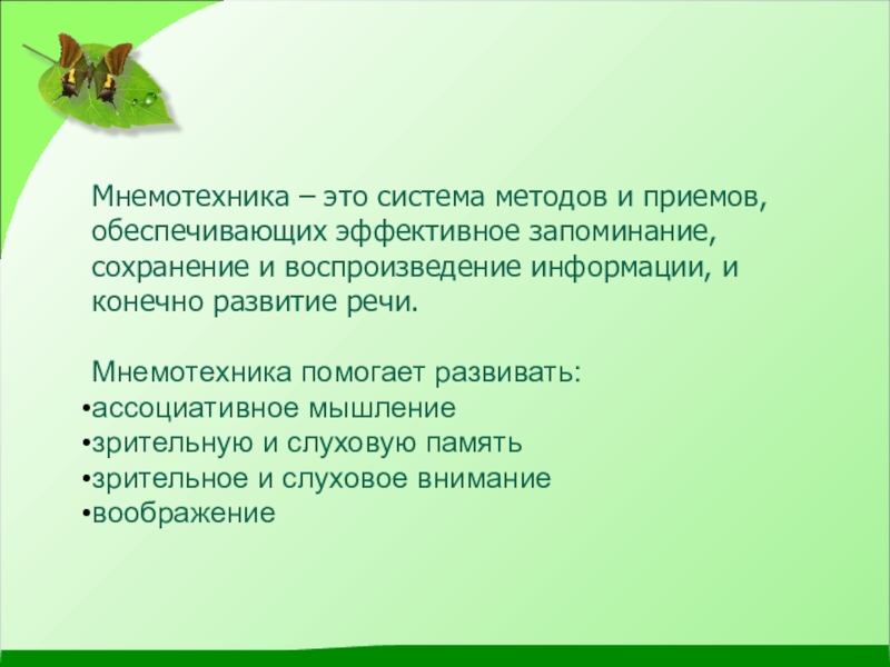 Слайд 4Мнемотехника – это система методов и приемов, обеспечивающих эффективное запоминание, сохранение