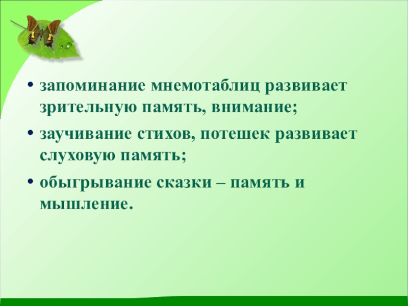 Слайд 12запоминание мнемотаблиц развивает зрительную память, внимание;