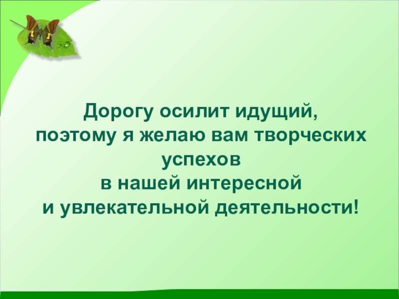 Дорогу осилит идущий, поэтому я желаю вам творческих успехов в нашей интересной и увлекательной деятельности!