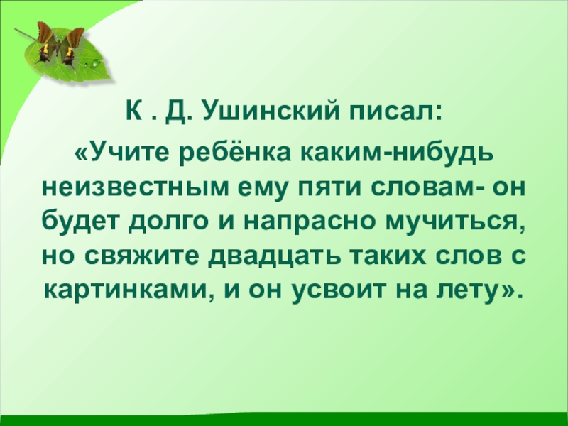 К . Д. Ушинский писал:«Учите ребёнка каким-нибудь неизвестным ему пяти словам- он будет долго и напрасно мучиться,