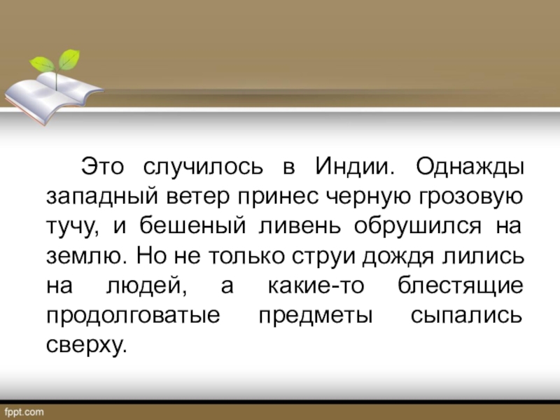 ветер принес черную грозовую тучу, и бешеный ливень обрушился на землю. Но не только струи дождя лились на людей, а какие-то блестящие продолговатые предметы сыпались сверху.