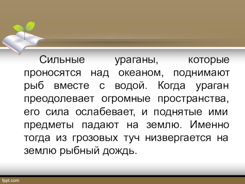 Слайд 12 Сильные ураганы, которые проносятся над океаном, поднимают рыб вместе с водой.