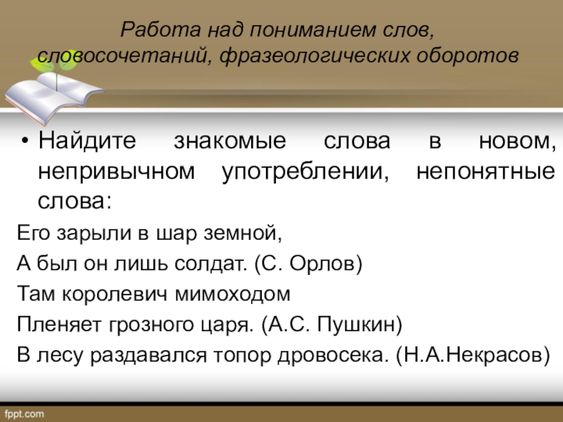 Слайд 2Работа над пониманием слов, словосочетаний, фразеологических оборотов