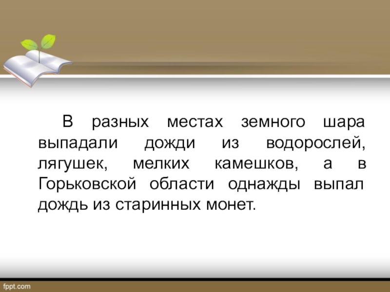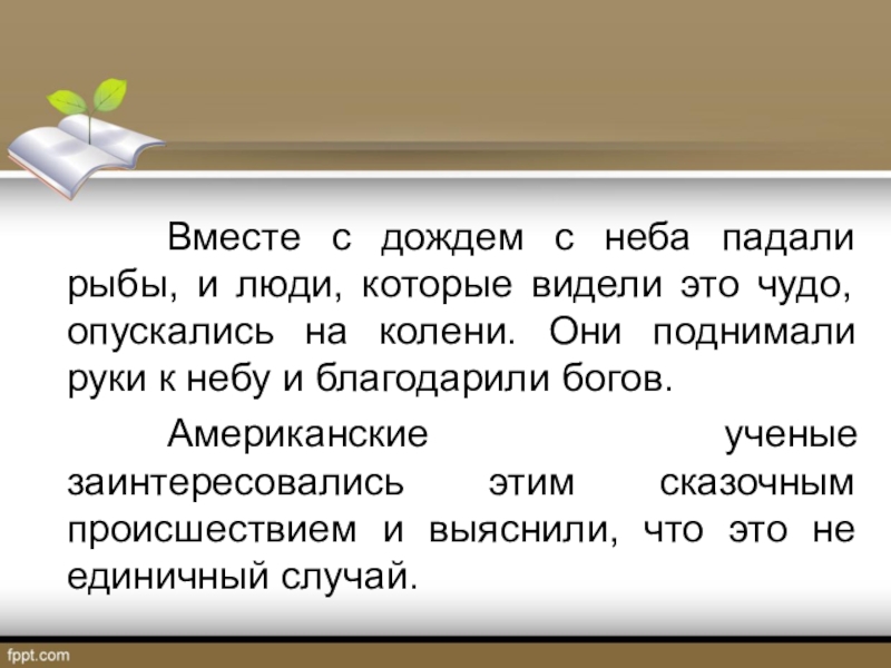 Слайд 10 Вместе с дождем с неба падали рыбы, и люди, которые видели