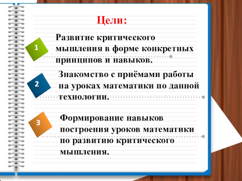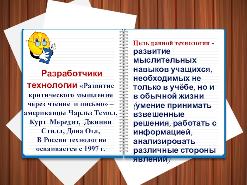 Цель данной технологии - развитие мыслительных навыков учащихся, необходимых не только в учёбе, но и в обычной жизни (умение принимать взвешенные решения, работать с информацией, анализировать различные стороны явлений)