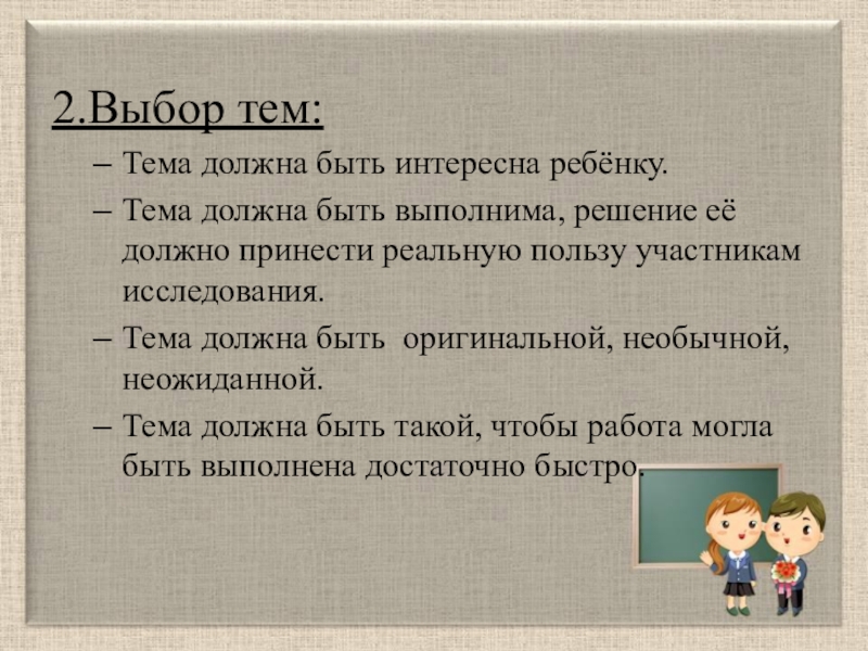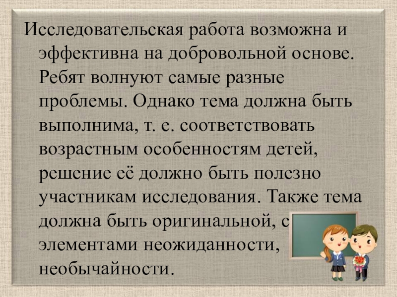 разные проблемы. Однако тема должна быть выполнима, т. е. соответствовать возрастным особенностям детей, решение её должно быть полезно участникам исследования. Также тема должна быть оригинальной, с элементами неожиданности, необычайности.
