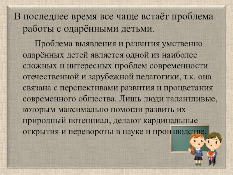 Слайд 5В последнее время все чаще встаёт проблема работы с одарёнными детьми.