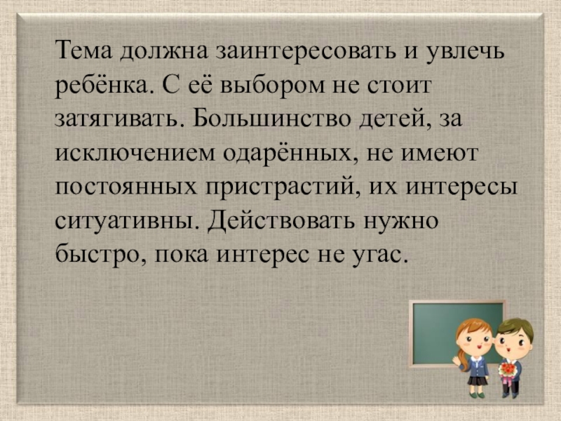 Слайд 25 Тема должна заинтересовать и увлечь ребёнка. С её выбором