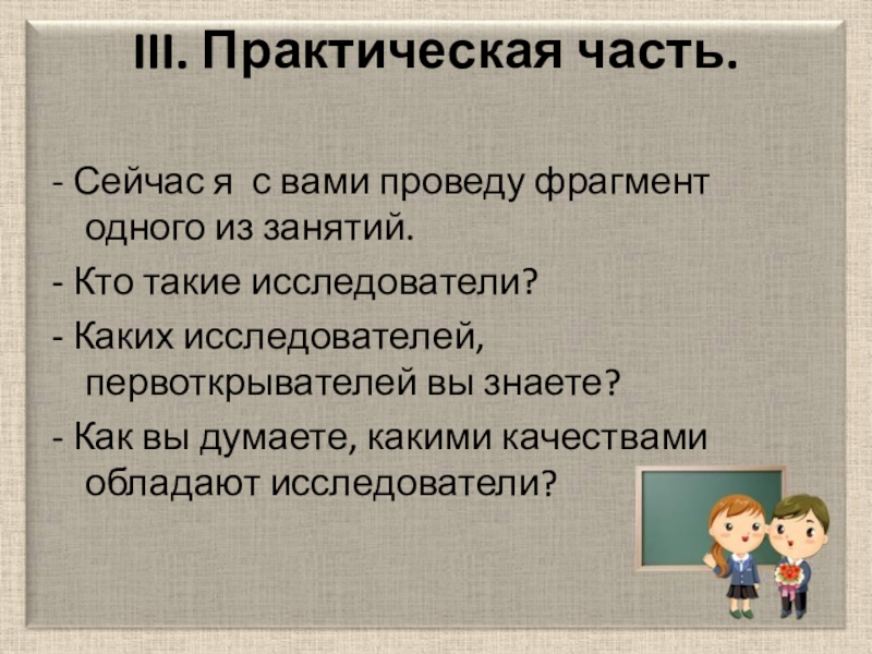 После выступления обязательно проводим его обсуждение. Даём слушателям возможность задать вопросы. Так ребята знакомятся с общей схемой деятельности. На данном этапе учитель выступает в роли консультанта-помощника.