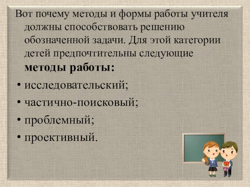 Слайд 8Вот почему методы и формы работы учителя должны способствовать решению обозначенной