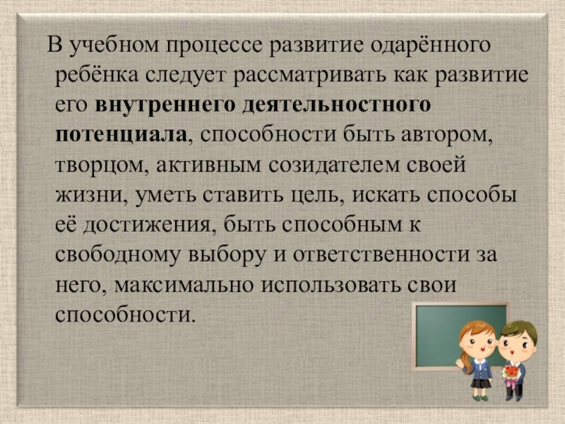 Слайд 7 В учебном процессе развитие одарённого ребёнка следует рассматривать как развитие