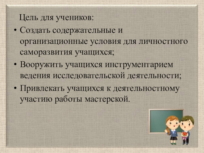 Привлекать учащихся к деятельностному участию работы мастерской.