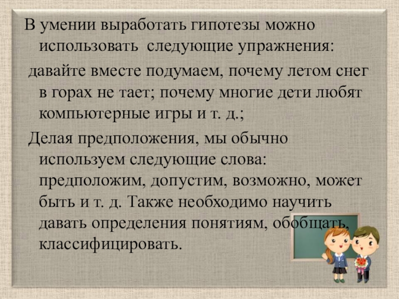 Делая предположения, мы обычно используем следующие слова: предположим, допустим, возможно, может быть и т. д. Также необходимо научить давать определения понятиям, обобщать, классифицировать.