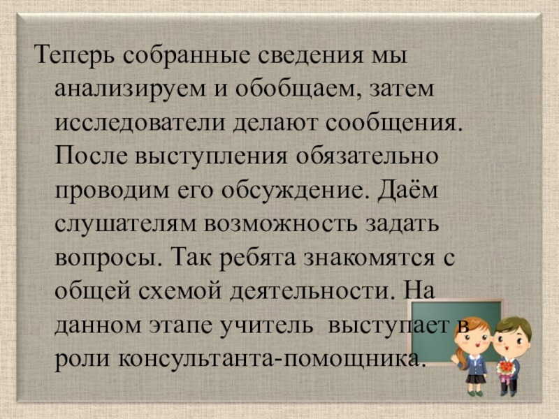 Слайд 15Теперь собранные сведения мы анализируем и обобщаем, затем исследователи делают сообщения.