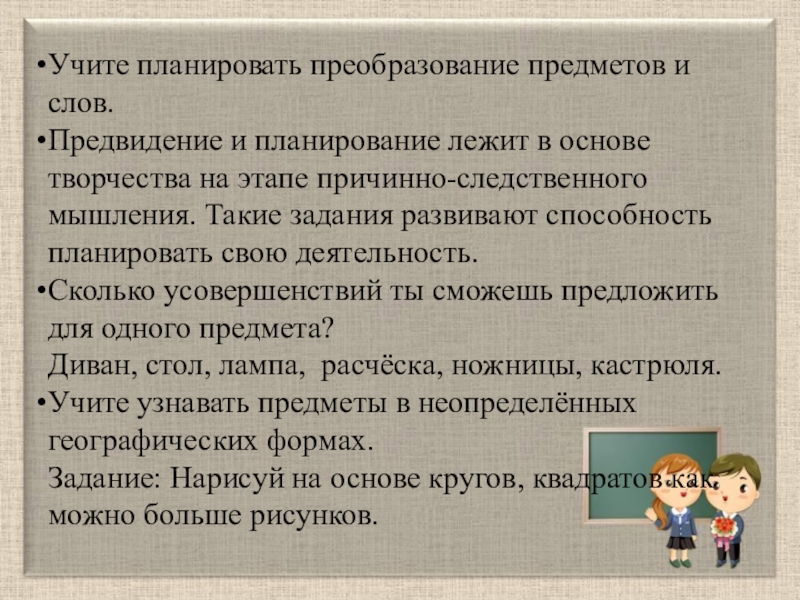 творчества на этапе причинно-следственного мышления. Такие задания развивают способность планировать свою деятельность.