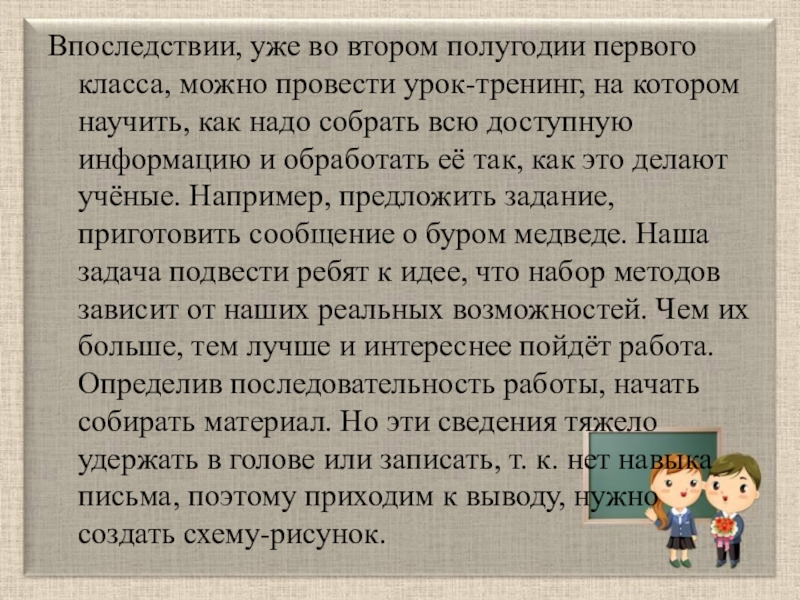 котором научить, как надо собрать всю доступную информацию и обработать её так, как это делают учёные. Например, предложить задание, приготовить сообщение о буром медведе. Наша задача подвести ребят к идее, что набор методов зависит от наших реальных возможностей. Чем их больше, тем лучше и интереснее пойдёт работа. Определив последовательность работы, начать собирать материал. Но эти сведения тяжело удержать в голове или записать, т. к. нет навыка письма, поэтому приходим к выводу, нужно создать схему-рисунок.
