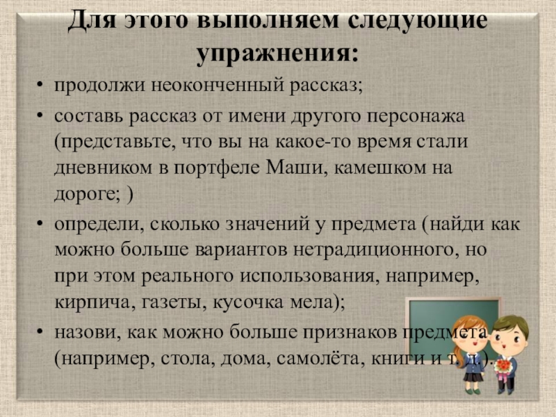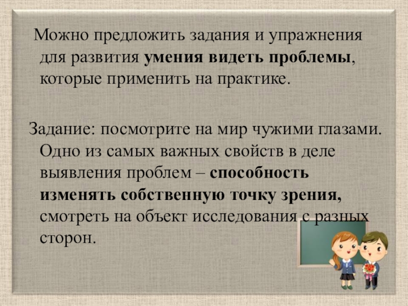 Слайд 17 Можно предложить задания и упражнения для развития умения видеть проблемы,