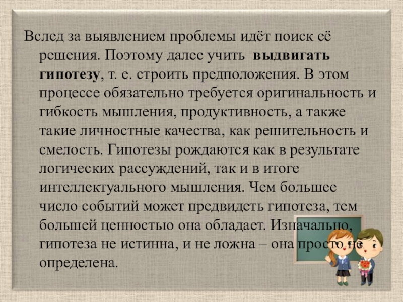 выдвигать гипотезу, т. е. строить предположения. В этом процессе обязательно требуется оригинальность и гибкость мышления, продуктивность, а также такие личностные качества, как решительность и смелость. Гипотезы рождаются как в результате логических рассуждений, так и в итоге интеллектуального мышления. Чем большее число событий может предвидеть гипотеза, тем большей ценностью она обладает. Изначально, гипотеза не истинна, и не ложна – она просто не определена.