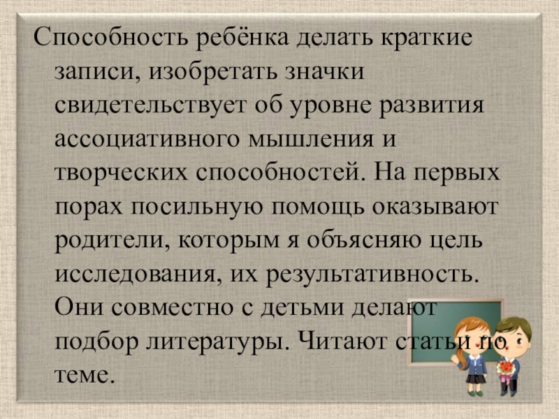 Слайд 14Способность ребёнка делать краткие записи, изобретать значки свидетельствует об уровне развития