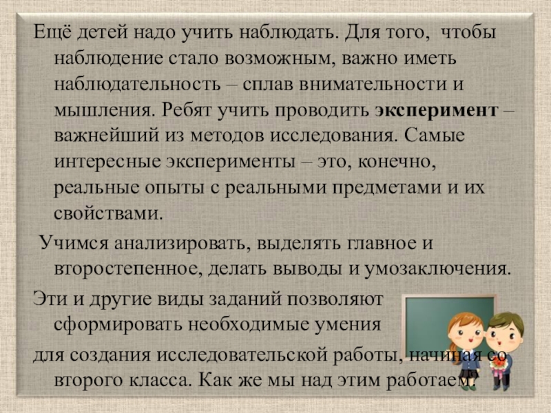 важно иметь наблюдательность – сплав внимательности и мышления. Ребят учить проводить эксперимент – важнейший из методов исследования. Самые интересные эксперименты – это, конечно, реальные опыты с реальными предметами и их свойствами.
