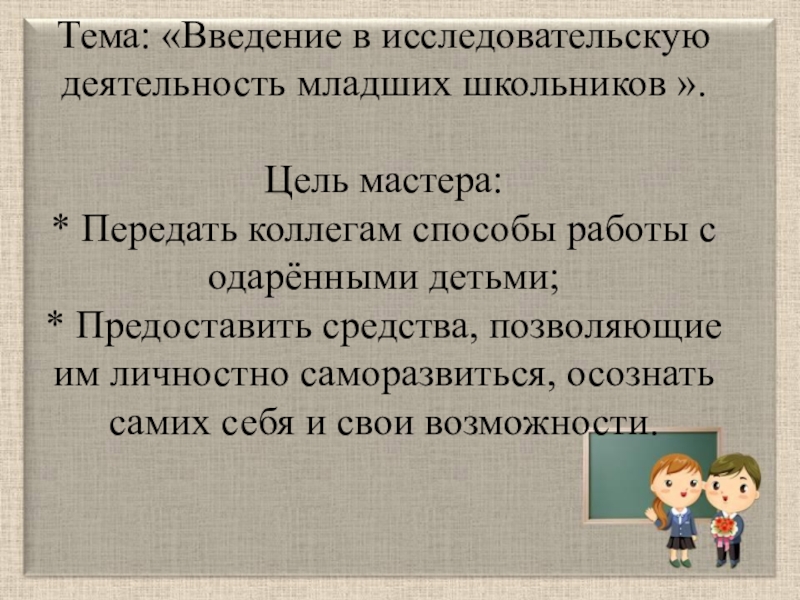 Слайд 2Тема: «Введение в исследовательскую деятельность младших школьников ».