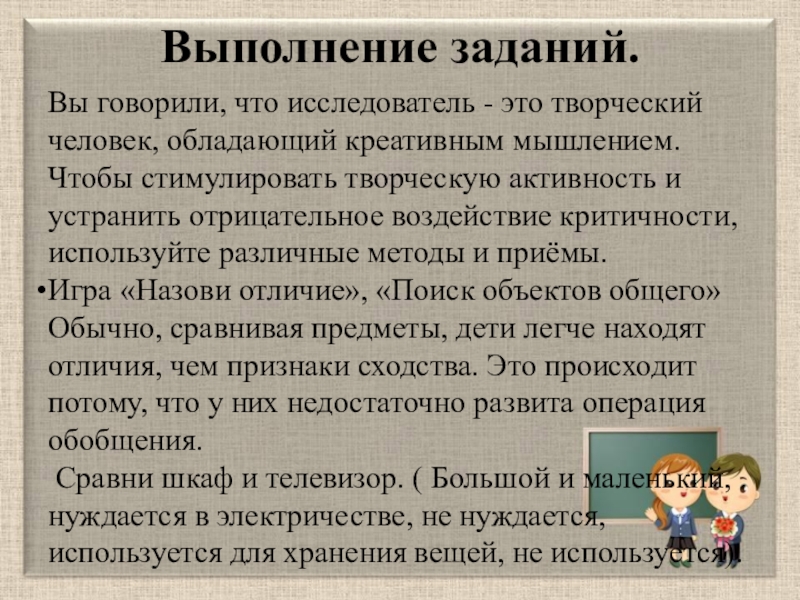 Обычно, сравнивая предметы, дети легче находят отличия, чем признаки сходства. Это происходит потому, что у них недостаточно развита операция обобщения.