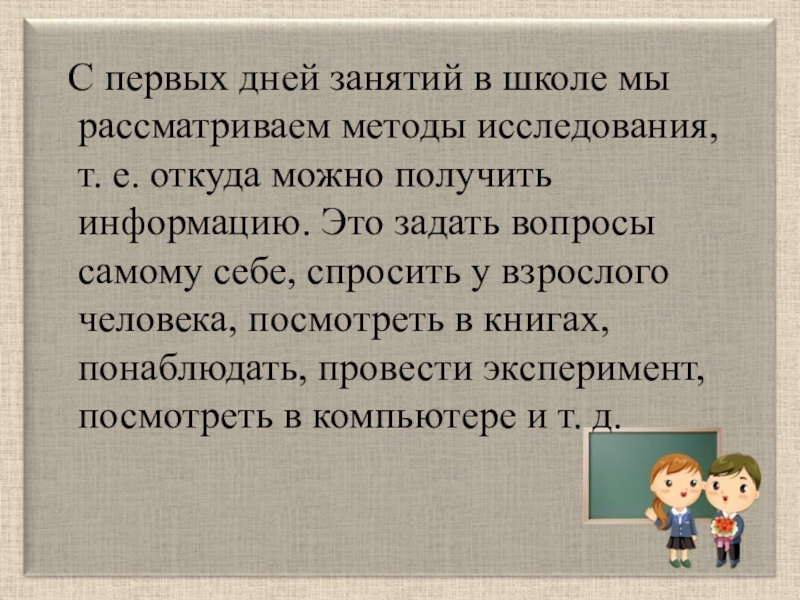 Слайд 12 С первых дней занятий в школе мы рассматриваем методы исследования,