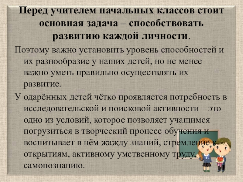 Слайд 6Перед учителем начальных классов стоит основная задача – способствовать развитию каждой