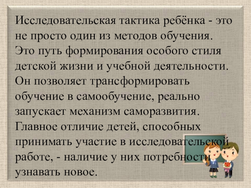 Слайд 36Исследовательская тактика ребёнка - это не просто один из методов обучения.