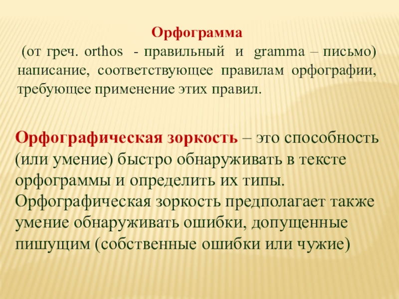(от греч. orthos - правильный и gramma – письмо) написание, соответствующее правилам орфографии, требующее применение этих правил.