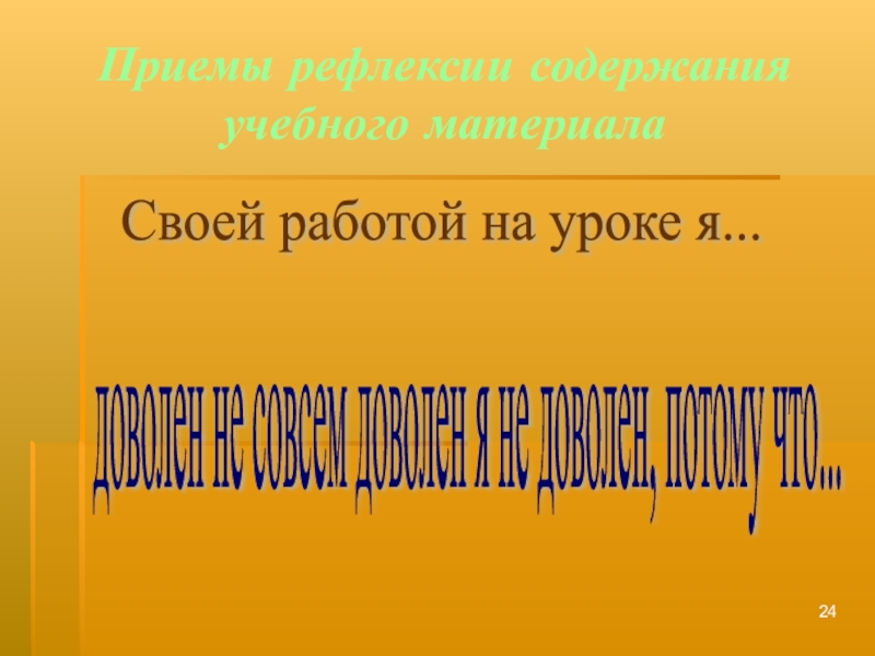 Приемы рефлексии содержания учебного материалаСвоей работой на уроке я... доволен не совсем доволен я не доволен, потому