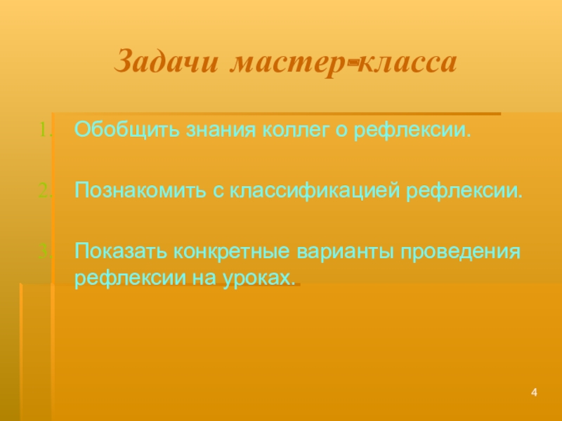 Задачи мастер-классаОбобщить знания коллег о рефлексии. Познакомить с классификацией рефлексии.Показать конкретные варианты проведения рефлексии на уроках.