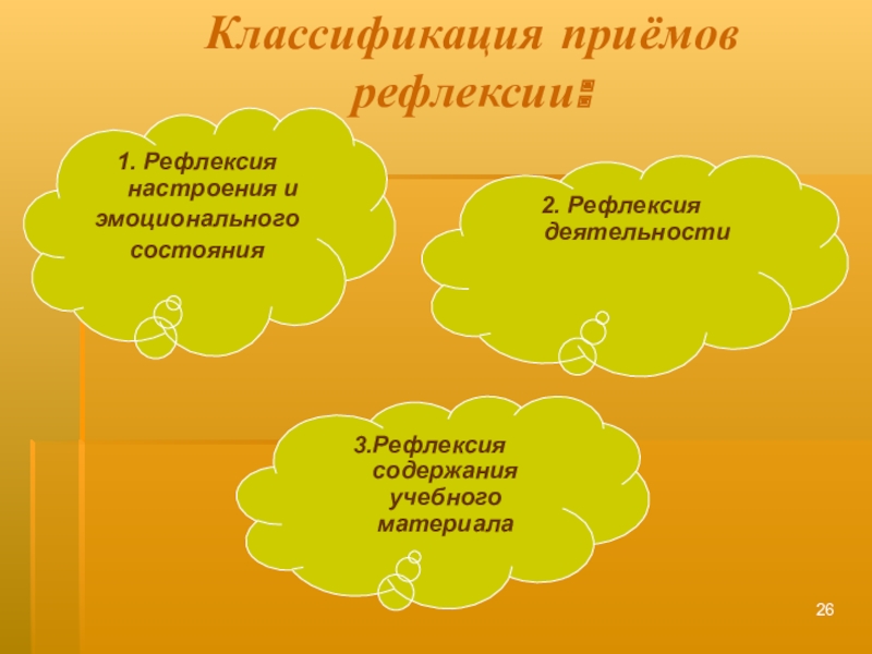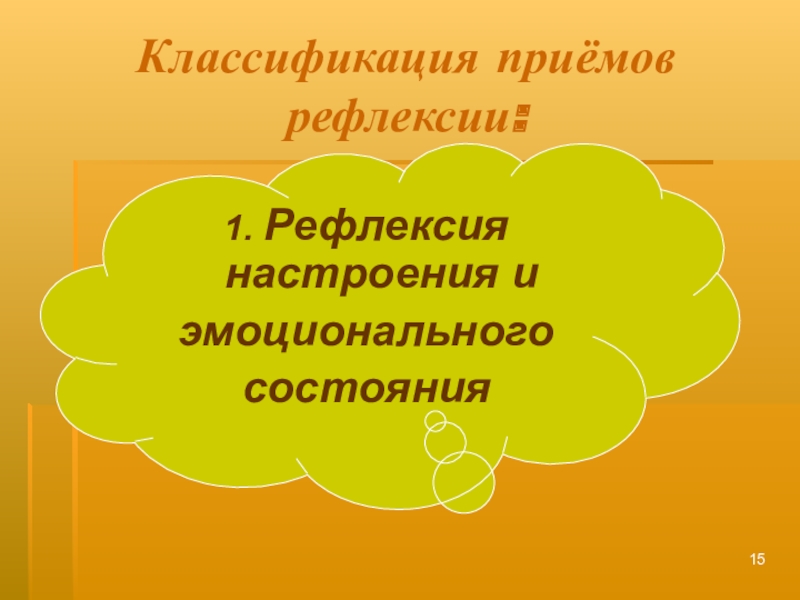 Классификация приёмов рефлексии:1. Рефлексия настроения и эмоционального состояния