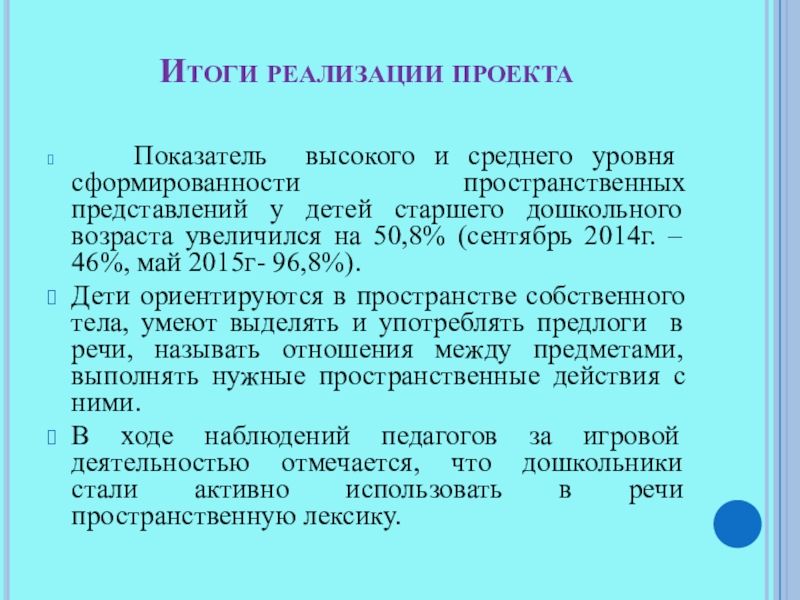 Итоги реализации проекта   Показатель высокого и среднего уровня сформированности пространственных представлений у детей старшего дошкольного