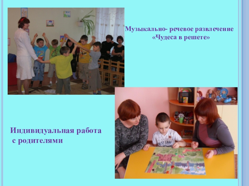 Музыкально- речевое развлечение«Чудеса в решете»Индивидуальная работа с родителями