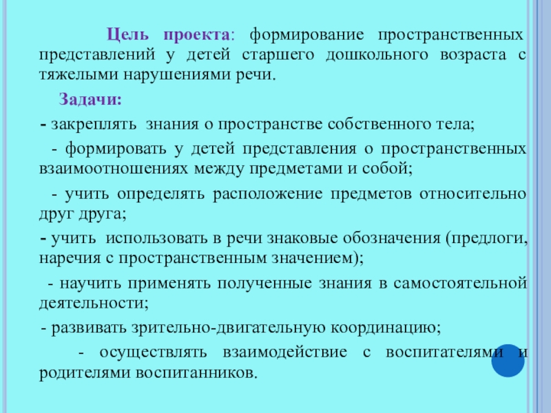Цель проекта: формирование пространственных представлений у детей старшего дошкольного возраста с тяжелыми нарушениями речи. Задачи: - закреплять знания о пространстве собственного тела; - формировать у детей представления о