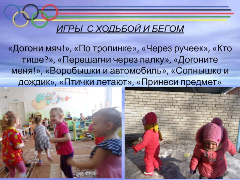 «Догони мяч!», «По тропинке», «Через ручеек», «Кто