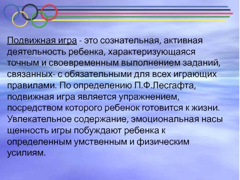 своевременным выполнением заданий, связанных- с обязательными для всех играющих правилами. По определению П.Ф.Лесгафта, подвижная игра является упражнением, посредством которого ребенок готовится к жизни. Увлекательное содержание, эмоциональная насыщенность игры побуждают ребенка к определенным умственным и физическим усилиям.