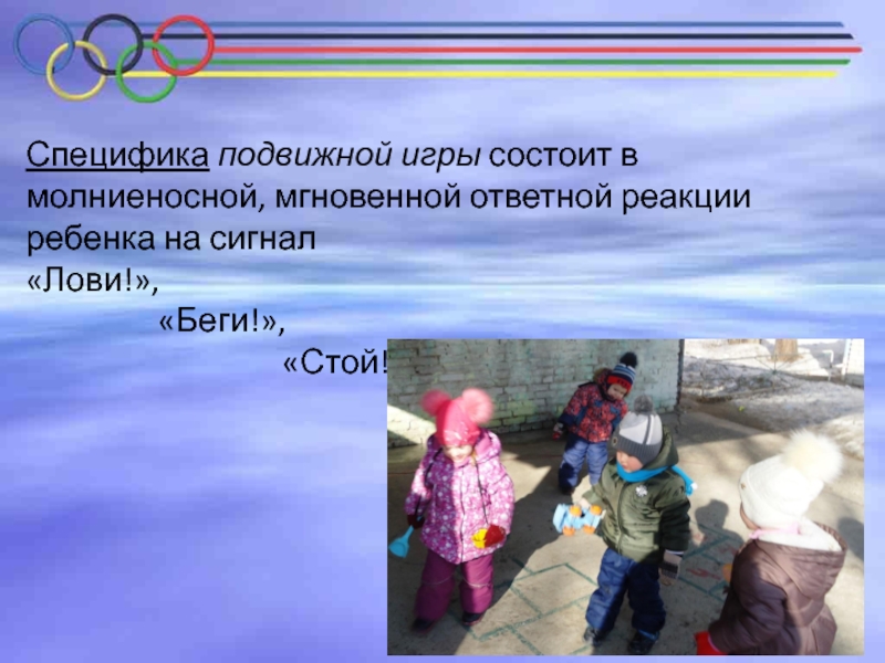 Слайд 8Специфика подвижной игры состоит в молниеносной, мгновенной ответной реакции ребенка на сигнал