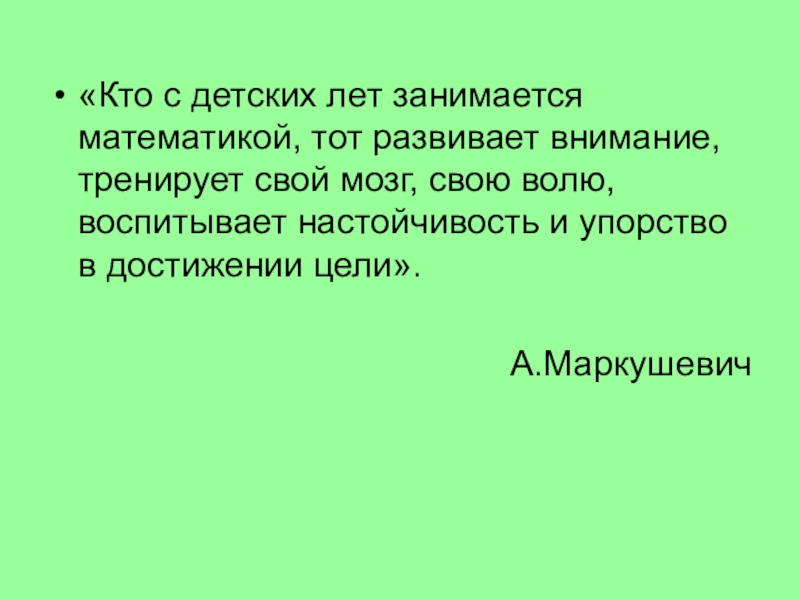 «Кто с детских лет занимается математикой, тот развивает внимание, тренирует свой мозг, свою волю, воспитывает настойчивость и