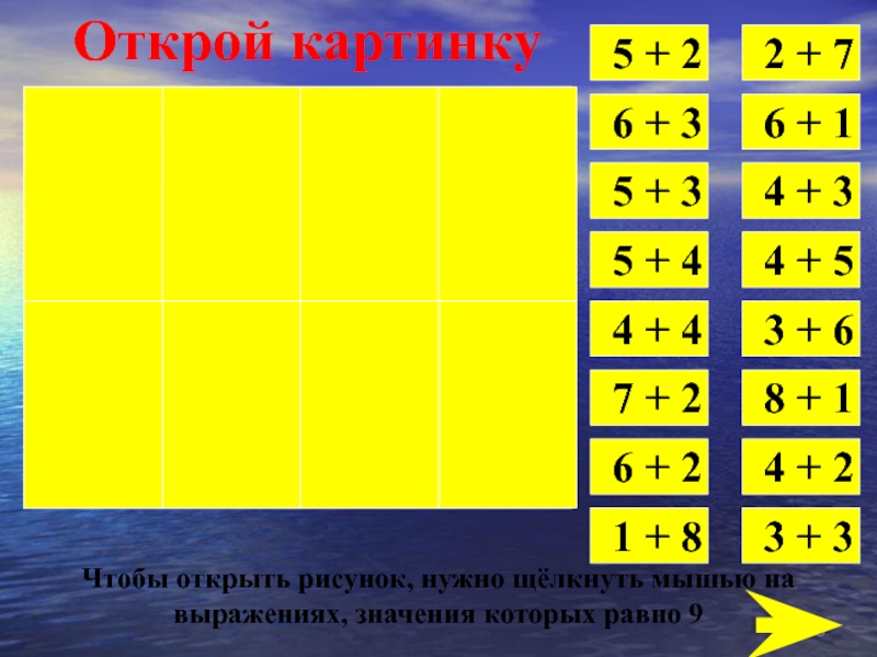 Чтобы открыть рисунок, нужно щёлкнуть мышью на выражениях, значения которых равно 9