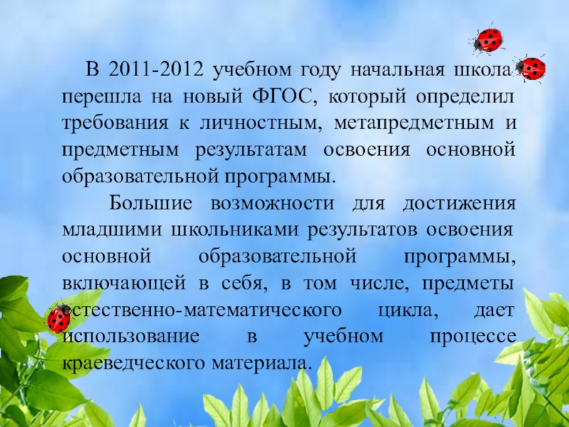 Большие возможности для достижения младшими школьниками результатов освоения основной образовательной программы, включающей в себя, в том числе, предметы естественно-математического цикла, дает использование в учебном процессе краеведческого материала.