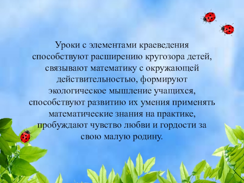 окружающей действительностью, формируют экологическое мышление учащихся, способствуют развитию их умения применять математические знания на практике, пробуждают чувство любви и гордости за свою малую родину.