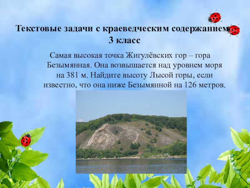 – гора Безымянная. Она возвышается над уровнем моря на 381 м. Найдите высоту Лысой горы, если известно, что она ниже Безымянной на 126 метров.